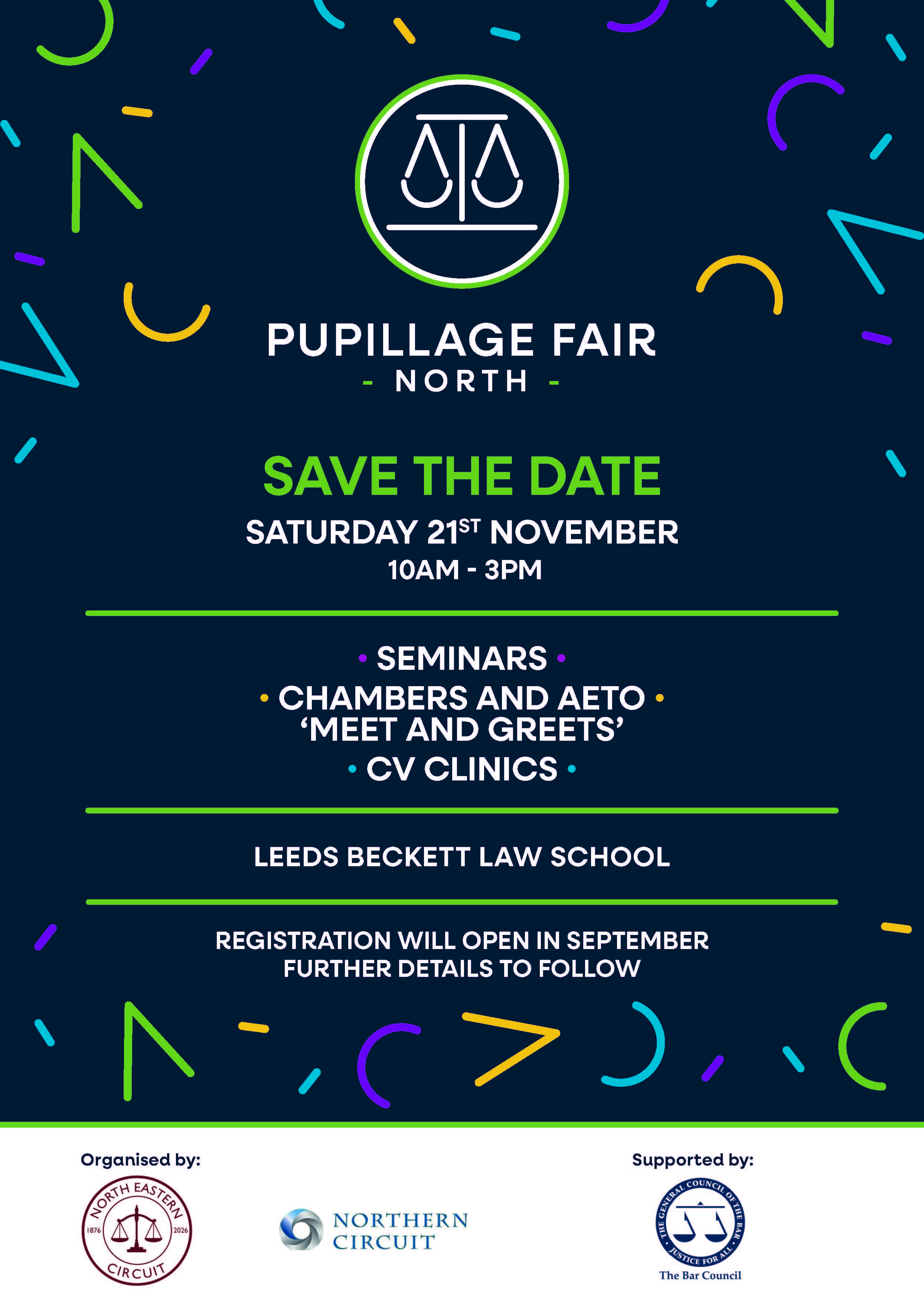 This year the Pupillage Fair North will be taking place at Leeds Becket Law School - please see poster attached. This is an important event on the Circuit calendar. It will be the third such event which is organised in conjunction with the North Eastern Circuit and is an excellent opportunity to showcase the Northern Circuit. All chambers on the Northern Circuit will be expected to take a stand and I would be very grateful if Heads of Chambers and Chambers Administrators could start planning now about how to ensure that as many of our wonderful Northern Circuit-trained former pupils as possible will be available on the day to speak to students and extol the virtues of life on the Northern Circuit. If any members of Circuit would be willing to be involved in a CV workshop or deliver a talk, I would be very grateful.